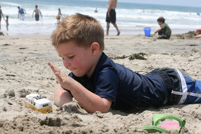 Hunter carrying on his tradition of burying his cars in the sand. He wanted this yellow bus from the surf shop because it had a peace sign on it. Are anyone's kids obsessed with peace signs right now, or is it just mine? I took the kids shopping at Fashion Island Mall in Newport, and every time we passed a shirt with a peace sign, Hunter and Ash would point and yell, "Peace!"